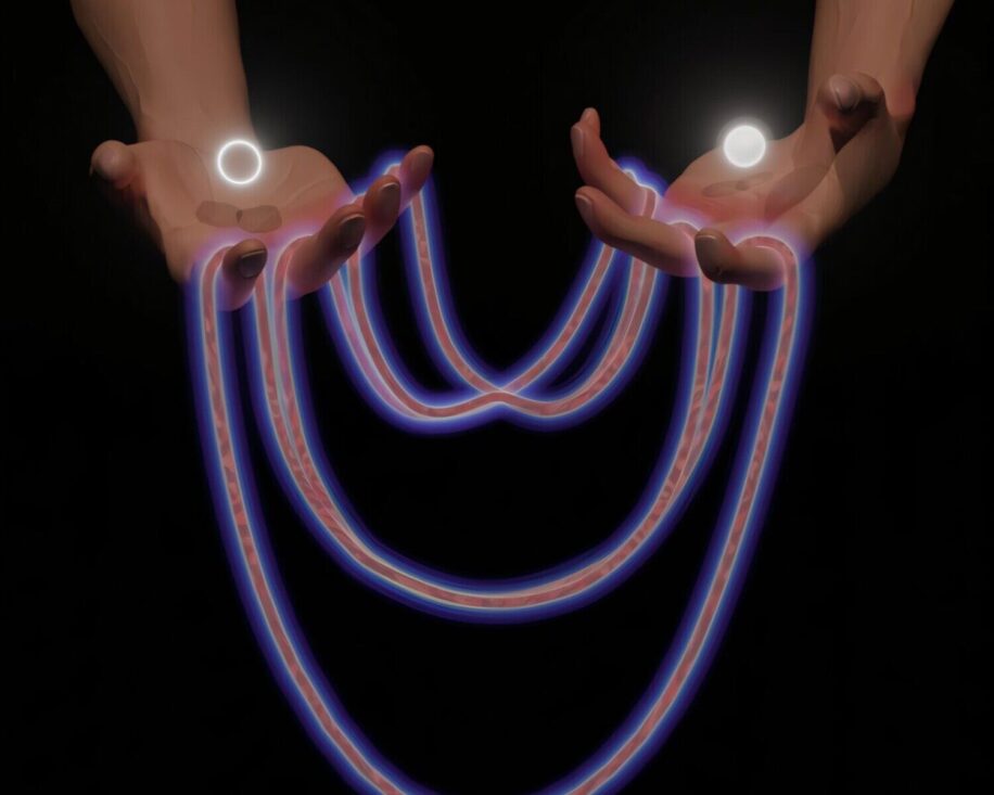 Modélisation 3D de deux mains tenant des bandes d'énergie lumineuses, à la manière d'un jeu de ficelle. L'une des bandes se replie sur elle-même, évoquant la dispersion de quantité de mouvement en forme de chapeau mexicain caractéristique des effets Floquet. Les orbes lumineuses au-dessus des mains, l'une sombre et l'autre claire, représentent l'électron et le trou qui forment ensemble un exciton. | Jack Featherstone
