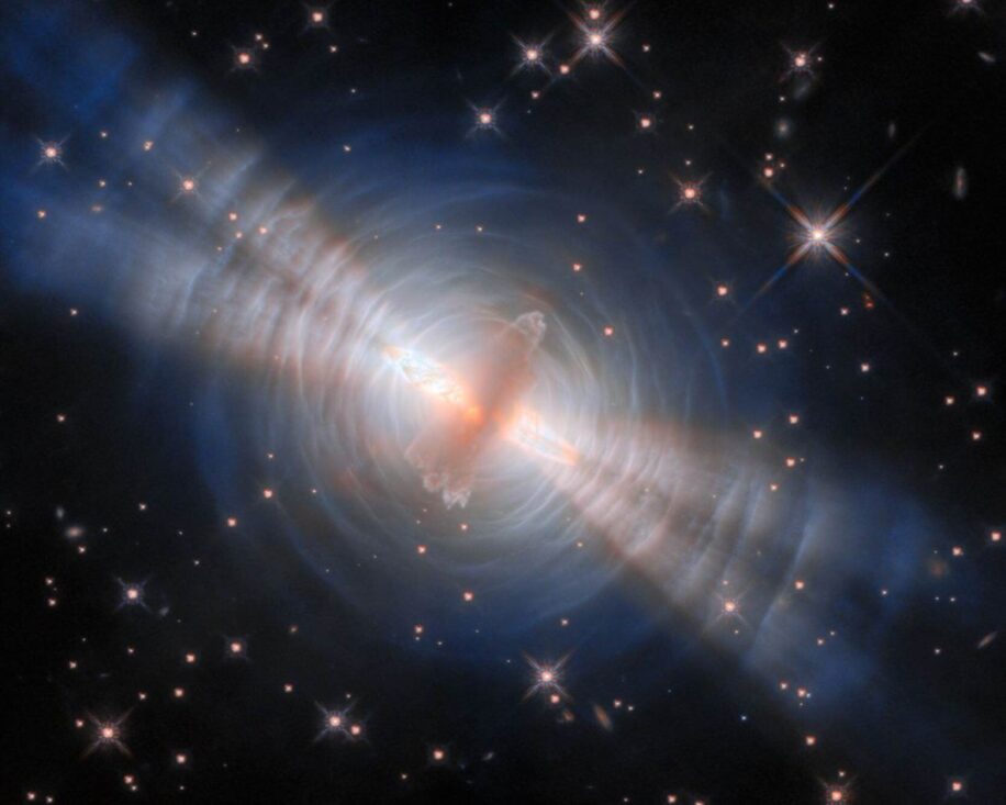 Cette structure fait que la lumière est projetée sous la forme de faisceaux jumeaux qui éclairent les lobes polaires en mouvement rapide et les séries d’arcs concentriques. Leurs formes, ainsi que leurs mouvements, pourraient indiquer des interactions gravitationnelles avec une ou plusieurs étoiles compagnes cachées dans l’épais disque de poussière de l’étoile.