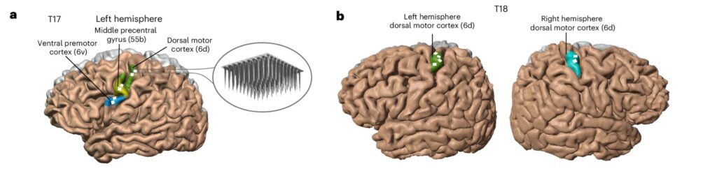 a ) Emplacements des microélectrodes du patient T17 dans l’hémisphère gauche. Deux microélectrodes ont été placées dans chacune des aires corticales suivantes : gyrus précentral dorsal (6d), moyen (55b) et ventral (6v). b ) Vues des hémisphères gauche et droit montrant les emplacements des microélectrodes du patient T18. Quatre microélectrodes ont été placées dans le gyrus précentral dorsal gauche et deux dans le gyrus précentral dorsal droit (aire 6d). © Jude et al.