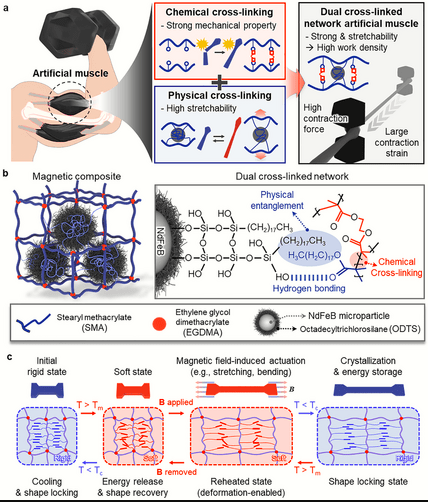 Le muscle artificiel mis au point par les chercheurs est un actionneur composite magnétique haute performance. Il se compose d’un complexe de polymères imitant la contractilité et la flexibilité des muscles naturels. L’un des polymères, à rigidité modulable, est intégré à une matrice recouverte de microparticules magnétiques, dont le comportement peut être ajusté à la demande pour modifier la rigidité du muscle.